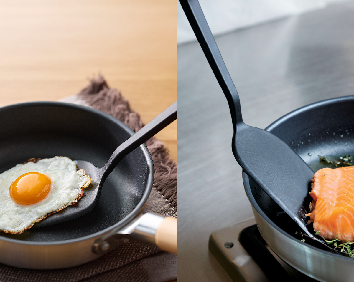 프라이팬 손상을 방지하는 내열 실리콘 소재와 뒤집기 편리한 긴 형태가 특징입니다. 착색 우려가 적은 블랙 컬러로 깔끔하게 사용할 수 있습니다.