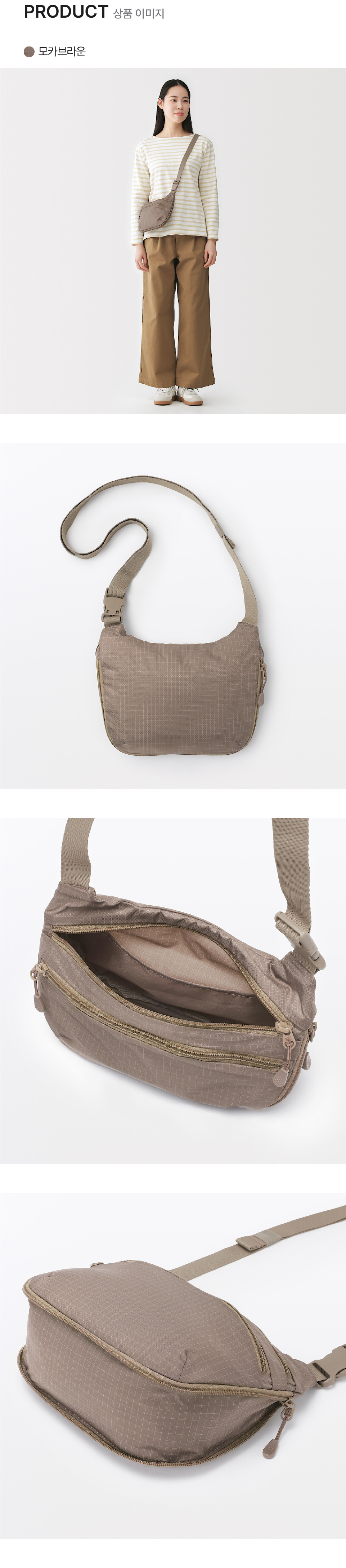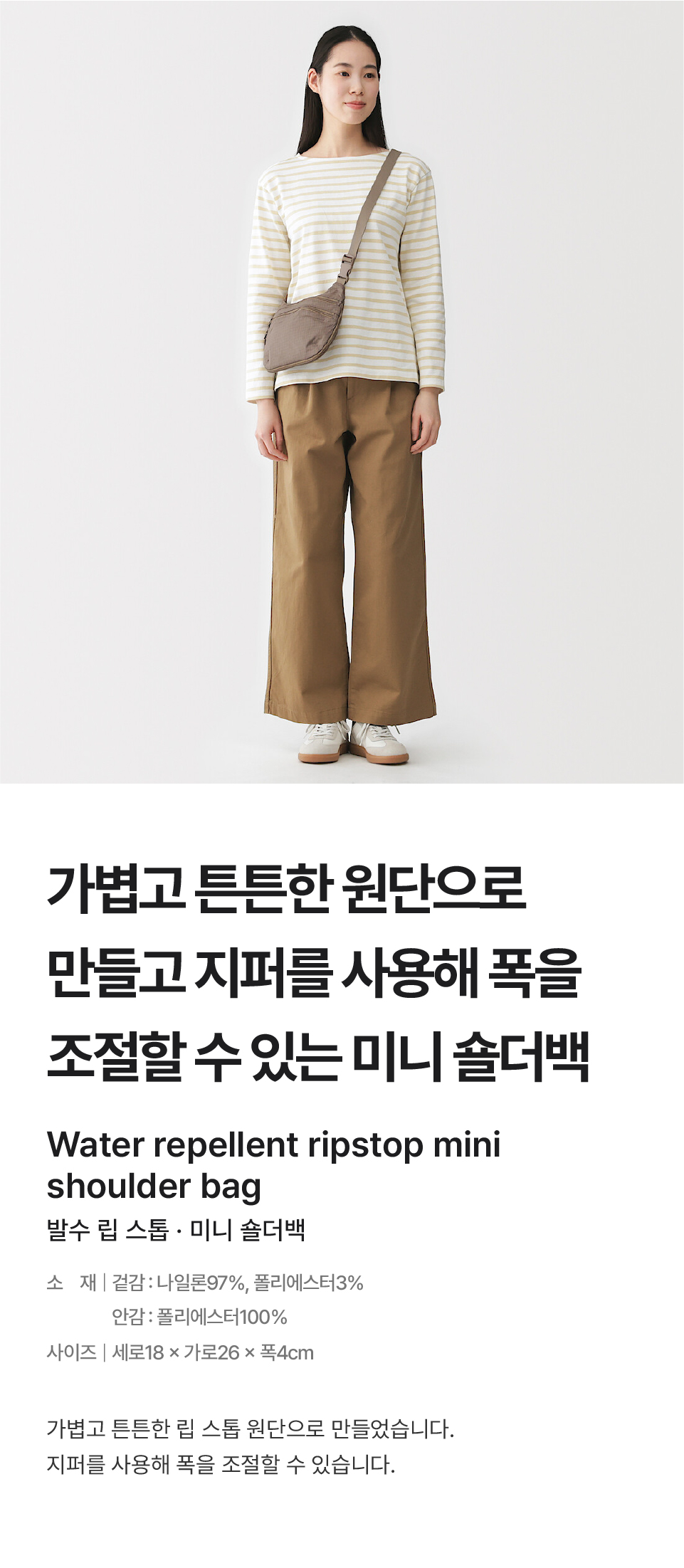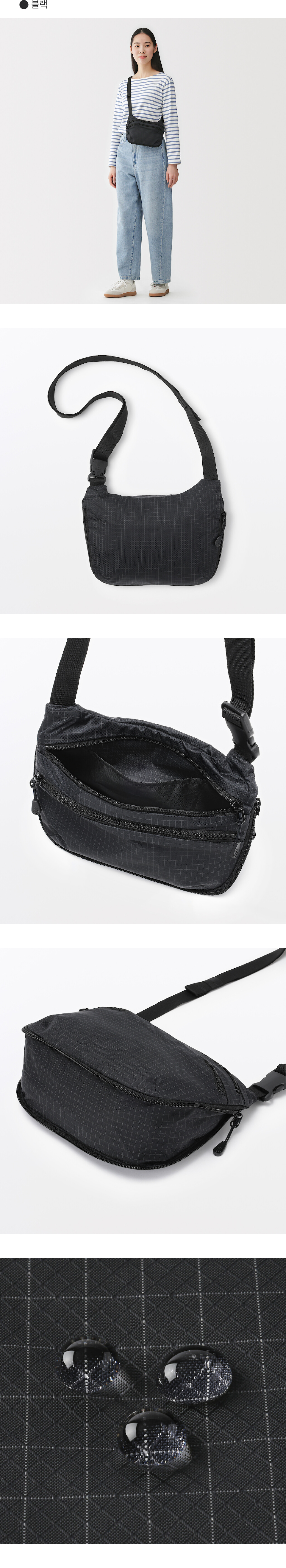 ●이 상품은 겉감에 재생 나일론을 97% 사용했습니다. ●이 상품은 겉감에 재생 폴리에스터를 3% 사용했습니다. ●이 상품은 안감에 재생 폴리에스터를 100% 사용했습니다. ●발수(물을 튕기기 쉬운 성질):사용에 의해 서서히 발수 효과가 사라집니다. ●이염될 수 있으니, 가방 안에 젖은 물건을 넣은 채로 장시간 방치하지 마십시오. ●이 제품은 우레탄 수지를 사용하고 있으며, 습기에 의해 열화되는 성질이 있으므로, 보관 상태에 따라 열화될 수 있다는 점을 양해해 주십시오. ●가능한 온도와 습도가 낮고 통풍이 잘되는 곳에 보관하십시오. ●폭을 넓혔을 때의 용량: 3 L